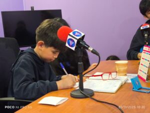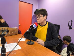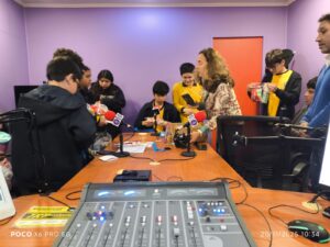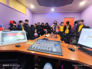 Acompañados por la monitora del taller, Macarena Vial, y la profesora Edith Saavedra, los jóvenes cambiaron el aula por el estudio, donde las señales en vivo, los equipos en pleno funcionamiento y el ambiente vibrante de la radiodifusión capturaron inmediatamente su atención.